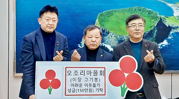 서귀포시 성산읍 오조리마을회(이장 고기봉)는 최근 성산읍사무소에서 성산읍지역사회보장협의체(공동위원장 김경범, 오상윤)에 사업 공모를 통해 받은 상금 중 일부인 150만원을 이웃 사랑 성금으로 전달했다.