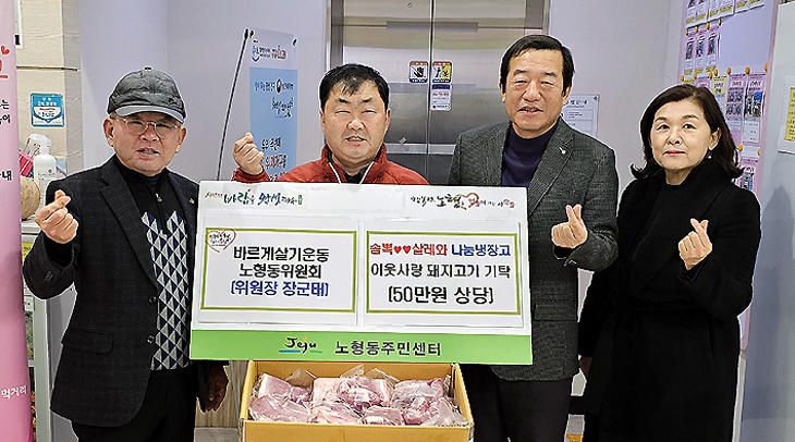 바르게살기운동 노형동위원회(위원장 장군태)는 지난달 31일 제주시 노형동주민센터(동장 서익천)에 어려운 이웃들을 위해 돼지고기 100팩(50만원 상당)을 기탁했다.