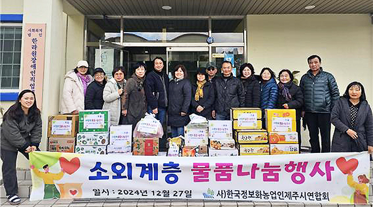 제주시정보화농업인연구회(회장 정복자)는 지난달 27일 연말연시 어려운 이웃과 사랑을 나누는 사회 기부문화 활동에 동참하기 위해 '사랑의 물품 나눔행사'를 진행했다.