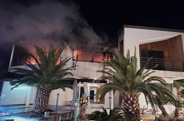 지난 2일 오후 6시45분쯤 제주시 애월읍 소재 한 펜션에서 화재가 발생해 소방당국이 화재 진압에 나서고 있다. 제주도소방안전본부 제공