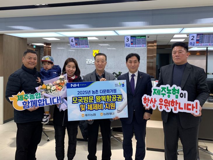 농협중앙회 제주본부(본부장 고우일)는 농협재단(이사장 강호동)의 후원으로 농촌 다문화가정 모국방문 지원사업을 추진해 제주 농촌지역 다문화가정 4가정(16명)을 선정하고 지원에 나섰다. 이에 따라 대표로 김녕농협(조합장 오충규)을 찾아 왕복항공권과 체제비 지원식을 가졌다.