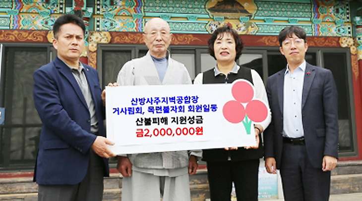 산방사(주지 벽공)·거사림회(회장 고동수)·목련불자회(회장 임정순)는 지난 15일 산방사에서 산불피해 지원 성금 200만원을 제주사회복지공동모금회(회장 강지언)에 기탁했다.