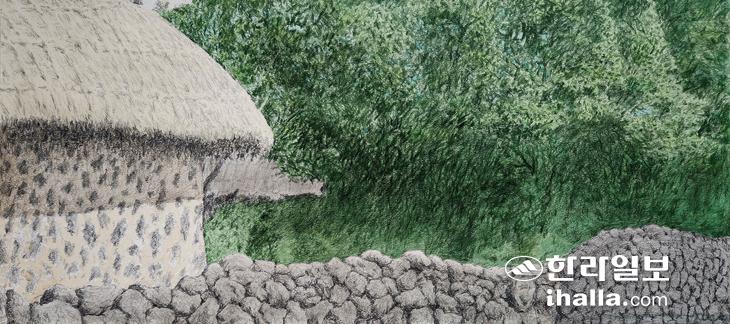 초가와 돌담을 더욱 아름답게 하는 것은 초록 나무다. 그 것도 연륜이 오래된 나무. 그릴 것으로 넘쳐나는 마을에서 찾은 면적 대비다. 너무도 단순하고 평면적인 분할 구도에 탐닉하게 된 것은 성읍1리라고 하는 마을이 보유한 문화재적 가치를 뛰어넘는 자연과의 조화다. 화면에는 등장하지 않지만 돌담의 원경, 그러니까 하단 오른쪽에는 맞은편에 있는 거대한 고목의 그림자가 드리워져 있다. 그에 상응하는 그림자가 초가의 처마에 의하여 벽의 색을 두 개의 요소로 나누고 있다. 그리고 이 모든 대비효과를 가능하게 하는 나무의 명암과 색채가 자연과 인간이 어떤 방식으로 만나 이웃하여 살아가게 되는 지 보여주는 것 같아서 그렸다. 이 마을이 보유한 자연친화적 요인을 민속마을이라고 하는 선입견 밖에서 바라보고 싶어서 그린 것이다. 초가집에서 유년시절을 보낸 필자는 흙과 돌담으로 쌓은 저 초가벽이 얼마나 정겹고 아름다운 예술품이라는 것을 잘 알고 있다. 자연에서 얻은 것으로 집을 짓고 살았으니 그 안에 사는 사람도 자연이었으리라는 무모한 확신을 그리는 내내 떠올렸다. 이 유서 깊은 마을에서 집담 넘어서 들려왔을 학동의 글 읽는 소리. 그리고 완고한 선비이신 할아버지의 꾸지람소리도 들려올 듯하다. 읍성이었으니 향교가 있었고, 인근 마을에서 향교에 학문을 닦으러 왔을 터. 외형적인 옛 것이 아니라 내면의 풍요로웠던 이 마을의 밝은 햇살을 그렸다. 아래로 빛과 그림자가 교차하며 오늘의 현실이 되었음을 확인하고자.