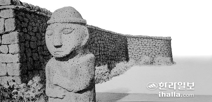 성읍1리 정의현 돌하르방은 제주목 돌하르방과 다르고 대정현 돌하르방과도 다른 독자적인 메시지가 있다. 풍경화이기에 앞서서 성담과 돌하르방이라고 하는 상징성을 하나의 시각적 심벌리즘 속에 녹여내고 싶어서 그린 것이다. 8월 오후 뙤약볕을 받아 눈부실 정도로 밝은 이미지의 성읍돌하르방. 이 고을이 추구하던 인격적 마인드가 상징화 된 형태라고 생각한다. 제주목 지역의 돌하르방처럼 우락부락함이란 찾아볼 수 없다. 德이라고 하는 가치관을 삶의 지표로 삼고 살아가던 사람들의 원만한 성품을 그대로 표현하고 있다. 석공의 제작 의도이기도 하거니와 의뢰한 주체세력의 요구하는 이상적 가치를 구현하고자 노력한 얼굴이다. 필자는 3읍 돌하르방 중에 정의현의 이 돌하르방을 제주인의 표상이라 여기며 살아왔다. 그 누구에게도 해를 끼치지 않을 품성이 돌에 의해서 만들어졌다는 의미다. 다공질 현무암으로 제작된 연유로 오랜 세월을 지나며 입모양은 마모되어져 보인다. 그래도 전체적인 윤곽과 정겨운 손동작은 품성이 어떠한 분이라는 것을 느낄 수 있게 한다. 곡면의 흐름이 오묘하게 흐르고 있기에 그리기에 참으로 까다로운 형태다. 성담을 배경으로 그리니 고전적인 이미지와 동시에 윤관이 도드라지는 판화적 강렬함이 작동하게 된다. 돌하르방의 구멍을 바느질 하듯 한 땀 한 땀 그려나가는 과정을 통하여 얻어낸 모습이다. 제주목 돌하르방으로 전형화 된 돌하르방에 온화한 충격을 가했으면 하는 희망을 가지고 성읍돌하르방의 개성을 살리려.