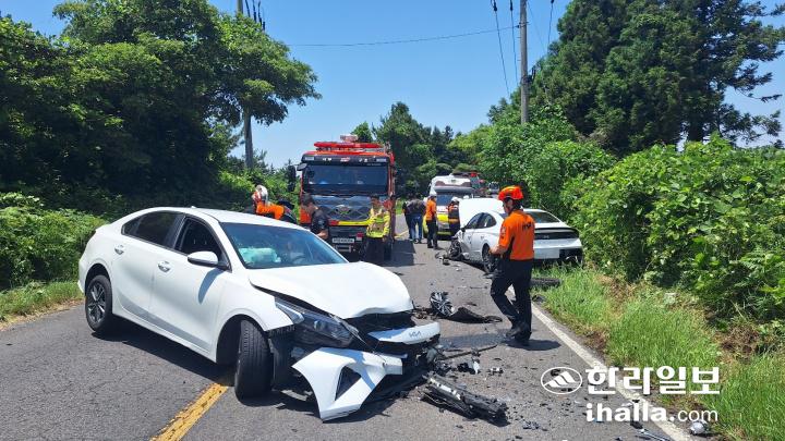 지난 6월 제주시 애월읍 어음리 도로에서 렌터카 2대와 전기차 1대가 연쇄 추돌했다. 이 사고로 20대 관광객 4명이 경상을 입어 인근 병원으로 이송됐다. 제주소방안전본부 제공