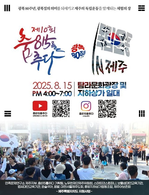 민족문제연구소 제주지부는 이달 15일 오후 4~7시 제주시 탐라문화광장과 제주중앙지하상가 일대에서 청소년들과 함께하는 광복절 기념 행사인 '제10회 춤, 815를 추다'를 연다. '제주의 얼을 찾아서'란 부제로 열리는 올해 행사는 신흥무관학교, 제주항일운동, 25년 독립군 등 3가지 주제로 꾸려진 15개 체험부스가 운영된다. 또 이날 오전 11시 제주아트센터, 오후 4시 관덕정, 오후 5시 칠성통에서는 댄스 챌린지가 이뤄지고, 오후 6시 탐라문화광장에서는 100명 이상이 함께 부르는 독립군 애국가 퍼포먼스가 진행돼 광복의 의미를 되새길 예정이다. 우천 시에는 모든 행사가 제주중앙지하상가에서 진행된다.