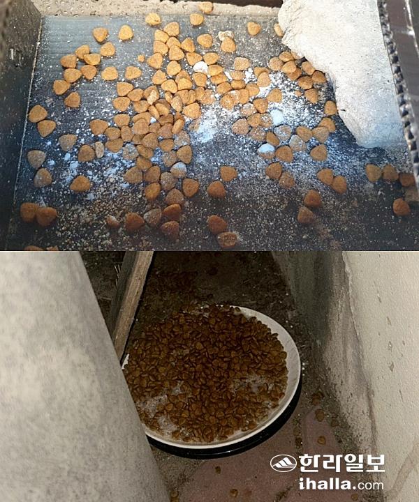 최근 제주시 삼양동의 길고양이 급식소에서는 수상한 파란 가루가 사료에 섞이거나 락스 냄새가 진동하는 등 동물학대 정황이 발견됐다. 한달 새 고양이 2마리가 의문사하기도 했다. 독자 제공