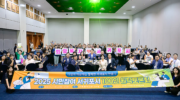 서귀포시는 서귀포시지역사회보장협의체(공동위원장 이신선)와 함께 지난 17일 제주국제컨벤션센터 영주홀에서 토론 참여자와 오순문 서귀포시장, 제주자치도의회 도의원 등 120여 명이 참석한 가운데 '2025 시민참여 서귀포시 100인 원탁토론회'를 개최했다.
