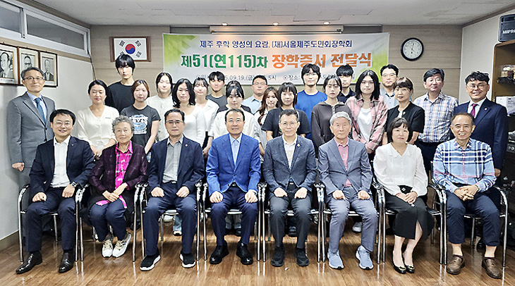 (재)서울제주도민회장학회(이사장 김창희)는 지난 19일 2025년 2학기 장학증서 전달식을 가졌다. 장학생은 27명이 선정됐으며, 200만원씩 총 5400만원이 지급됐다.