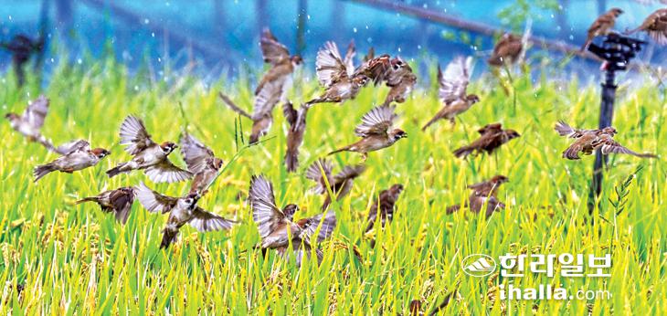 [한라일보] 절기상 추분인 23일 제주시 한경면 고산리 한 들녘에서 밭벼를 먹던 참새들이 날아오르고 있다. 강희만기자