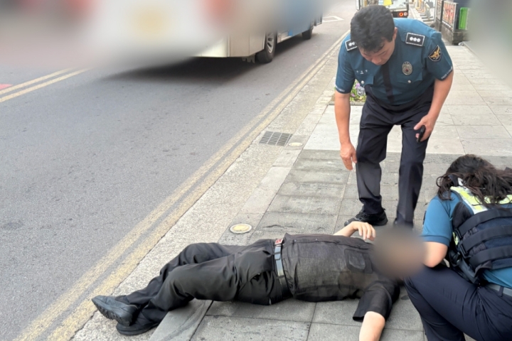 지난 22일 오후 6시 30분쯤 서귀포매일올레시장 일대 순찰을 돌던 중동지구대장 신창일 경정과 강영익 경사, 김나현 순경은 쓰러져 있던 70대 남성 A씨를 발견해 신속하게 조치했다. 서귀포경찰서 제공