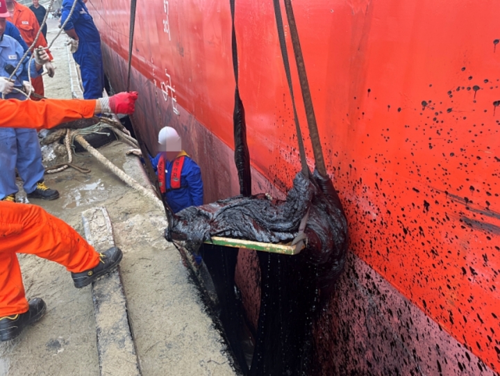 지난 27일 오후 3시 43분쯤 서귀포시 화순항에 정박 중이던 유조선에서 액상 아스팔트 110ℓ가 유출됐다. 서귀포해양경찰서 제공