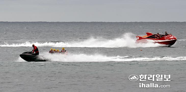 [한라일보] 27일 제주시 이호해수욕장 앞바다에서 피서객들이 쾌속보트와 수상오토바이를 타며 초가을 제주의 바다를 즐기고 있다. 강희만기자
