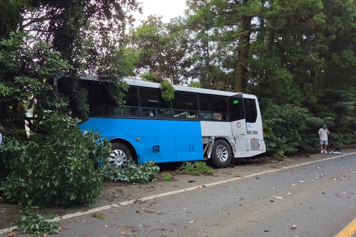 지난 30일 오후 제주시 구좌읍 송당리 비자림로 아부오름 인근 도로에서 30여 명이 탄 버스와 SUV가 충돌했다. 제주소방안전본부 제공