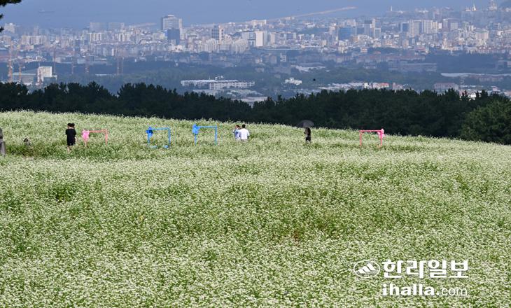 [한라일보] 지난달 30일 제주시 오라동 일원에 제주시가지를 배경으로 순백의 메밀꽃이 만개해 초가을 정취를 한껏 느끼게 해주고 있다. 강희만기자