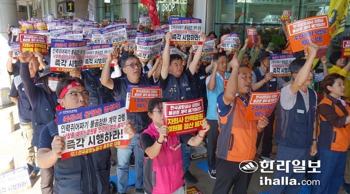 한국공항공사자회사노동연대는 1일 오전 제주국제공항 1번 게이트 앞에서 ‘전국공항노동조합 총파업 결의대회’를 열었다. 강희만기자
