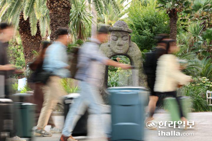 추석 연휴를 하루 앞둔 2일 오전 제주공항에 도착한 귀성객과 여행객이 주차장으로 향하고 있다. 연합뉴스