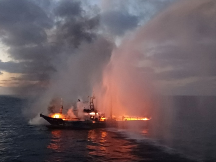 12일 오전 3시52분쯤 제주 서귀포시 마라도 남동쪽 약 35㎞ 해상에서 부산선적 대형선망 A호에서 화재가 발생, 출동한 해경 함정이 화재를 진압하고 있다. 서귀포해양경찰서 제공