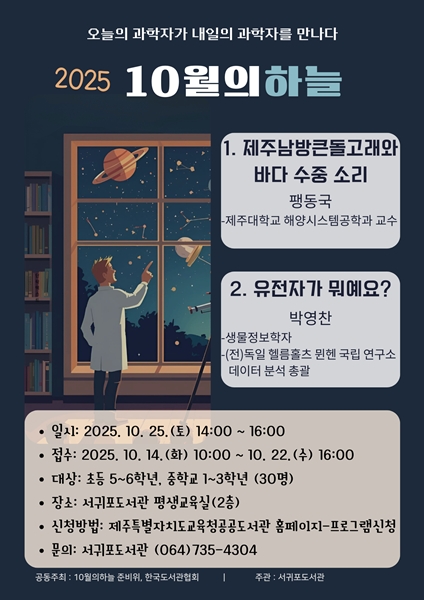 [한라일보] 서귀포도서관은 오는 25일 오후 2시부터 도서관 평생교육실에서 '10월의 하늘' 프로그램을 운영한다.