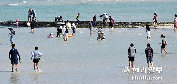 늦더위가 찾아온 지난 12일 제주시 한림읍 협재해수욕장에 많은 관광객들이 찾아 물놀이를 즐기고 있다. 강희만기자