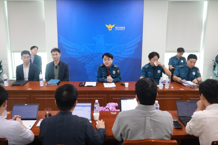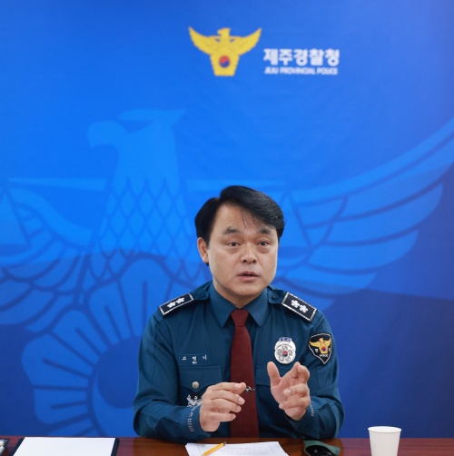 고평기 제주경찰청장이 15일 청 기자실에서 취임 후 첫 기자간담회를 갖고 캄보디아발 감금·폭행 등에 대한 수사 상황을 설명하고 있다. 제주경찰청 제공