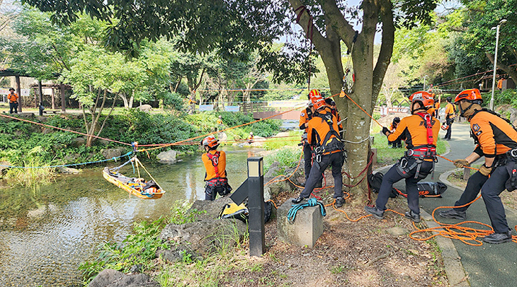 이번 훈련은 지난 13일부터 오는 21일까지 총 6회에 걸쳐 서귀포소방서 훈련탑과 솜반천 일대에서 진행된다.