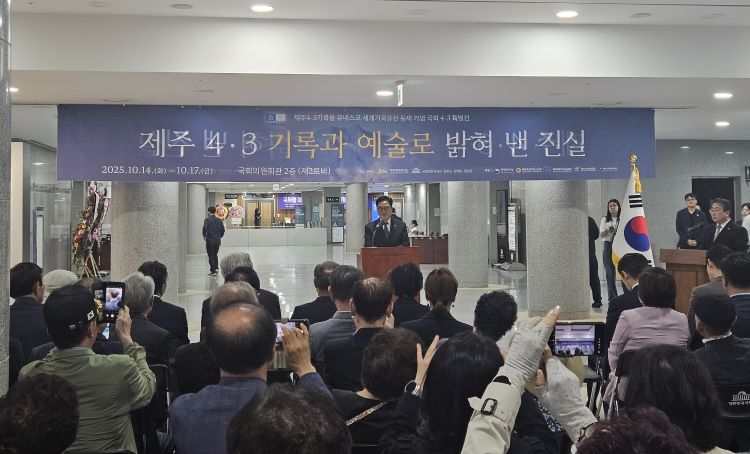우원식 국회의장이 15일 오후 국회의원회관에서 열린 '제주 4·3 기록과 예술로 밝혀낸 진실: 국회 4·3 특별전' 개막식에 참석해 인사말을 하고 있다.