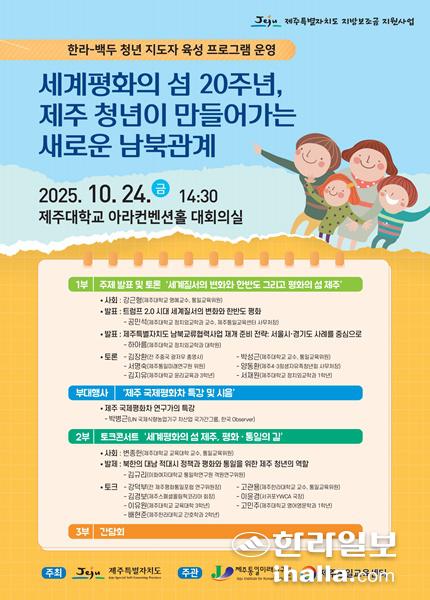 [한라일보] 세계평화의 섬 지정 20주년을 맞아 청년 세대가 주도하는 통일 논의의 장이 마련된다. 제주특별자치도가 주최하고 제주통일미래연구원과 제주통일교육센터가 주관하는 '2025년 한라-백두 청년지도자 육성 프로그램'이다.