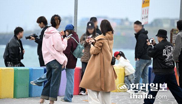 [한라일보] 21일 제주시 도두동 무지개해안을 찾은 관광객들이 찬 바람에 두터운 옷을 입고 있다. 강희만기자