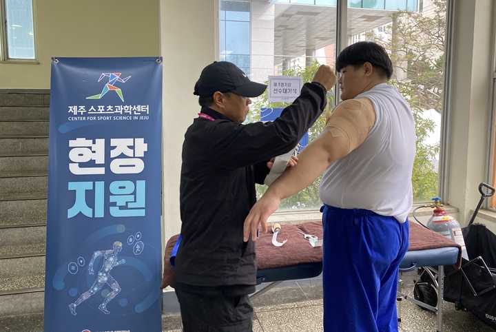 [한라일보] 제주스포츠과학센터가 제106회 전국체육대회에 출전한 제주선수단의 컨디셔닝 지원을 위해 경기장 곳곳을 누비고 있다.