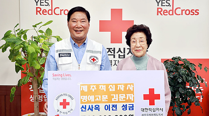 김문자 명예고문은 대한적십자사 제주특별자치도지사(회장 정태근)를 방문해 대한적십자사 제주지사의 신사옥 건립을 위해 성금 1000만원을 기탁했다.