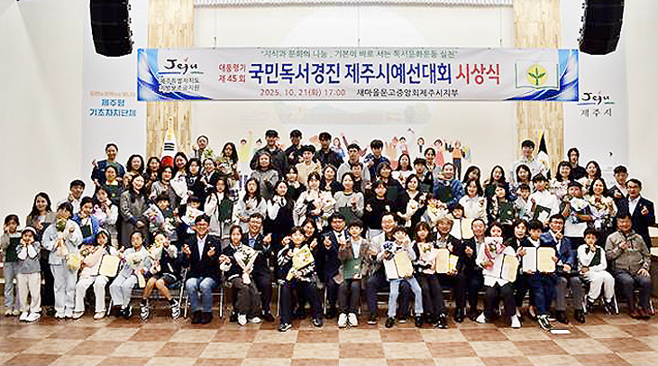 새마을문고중앙회제주시지부(회장 양용범)는 지난 21일 제주시청 1별관 회의실에서 독서생활화를 통한 국민의식 수준 향상에 기여하기 위한 '대통령기 제45회 국민독서경진 제주시예선대회 시상식'을 개최했다.