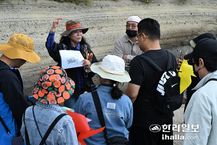 참가자들이 수월봉 일대 2개 코스를 걸으며 지질공원 해설사로부터 제주 자연자원의 가치와 수만 년에 걸친 지질 이야기를 듣고 있다.