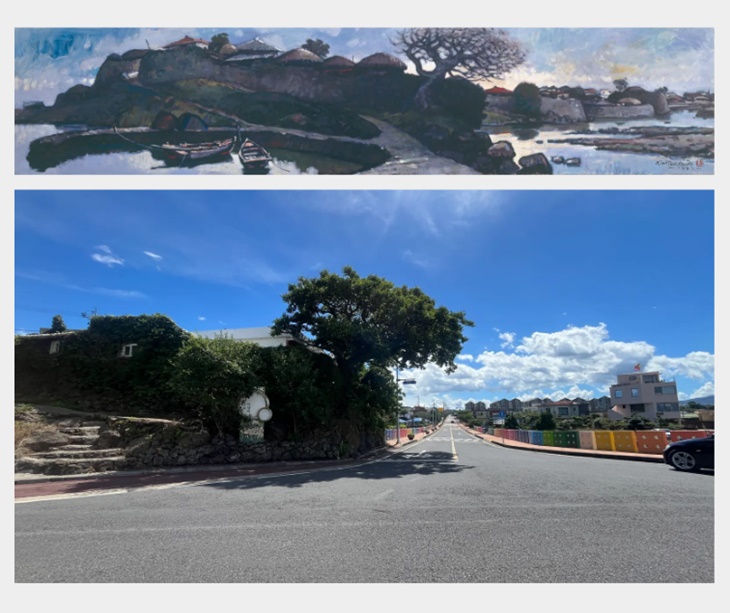 김택화의 '신흥리'(1997)와 작품 속 현재의 제주감귤국제마라톤 코스 모습. 김택화미술관 제공
