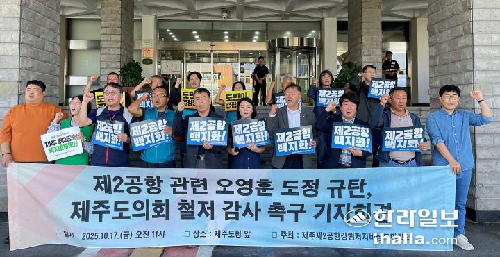 지난 17일 제주도청 앞에서 열린 제주제2공항강행저지비상도민회의 기자회견 모습.