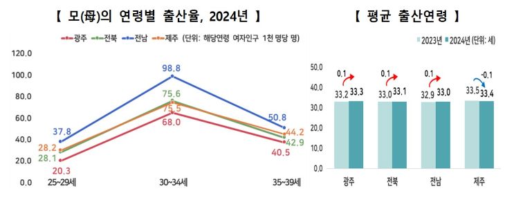 모의 평균 출산연령은 33.4세(제주시 33.3세, 서귀포시 33.7세)로, 2023년 33.5세(제주시 33.3세, 서귀포시 33.9세) 대비 소폭 낮았고, 전국 평균(33.7세)보다도 낮았다. 다만 광주 33.3세, 전북 33.1세, 전남 33.0세로 호남·제주지역에서는 제주가 가장 높았다.