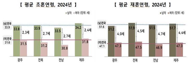 지난해 제주지역 연령별 혼인율(해당 연령 남성 또는 여성 인구 1000명 당 혼인건수)도 30~34세(남성 47.6건, 여성 46.3건)에서 가장 높았다. 평균 초혼연령은 남성 34.2세·여성 31.8세로, 2023년과 비교하면 남성은 0.1세 낮아졌고, 여성은 0.1세 높아졌다. 평균 재혼연령은 남성 51.7세, 여성은 47.3세로, 2023년과 비교하면 각각 0.1세씩 높아졌다.