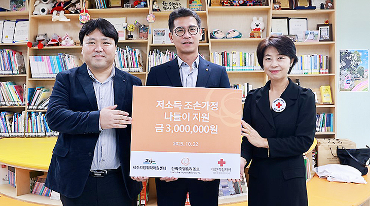 한화호텔앤드리조트(주)가 운영하는 한화리조트 제주(총지배인 이승용)는 제주가정위탁지원센터에서 대한적십자사 제주특별자치도지사(회장 정태근)에 조손가정 지원을 위한 성금 300만 원을 전달했다.