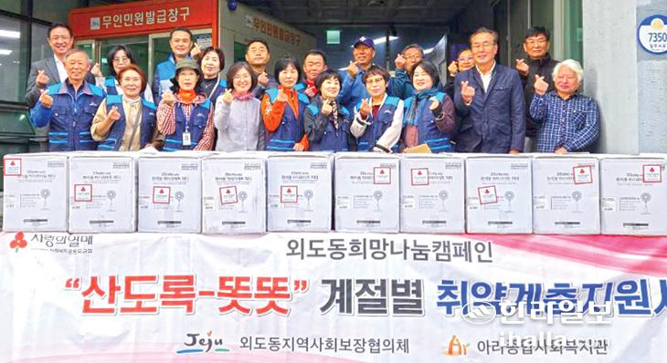 제주시 외도동 지역사회보장협의체(공동위원장 박기완ㆍ안창준)는 지난 27일 아라종합사회복지관과 함께 홀로사는 노인과 장애인가구에 전기히터 125대를 전달했다.