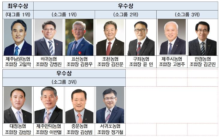 또 하귀농협(조합장 강병진), 표선농협(조합장 김용우)은 우수상 1위, 조천농협(조합장 김진문), 구좌농협(조합장 윤민)은 우수상 2위, 제주시농협(조합장 고봉주), 한경농협(조합장 김군진), 대정농협(조합장 강성방), 제주안덕농협(조합장 이한열), 중문농협(조합장 김성범), 서귀포농협(조합장 정기철)은 우수상 3위를 각각 수상했다.