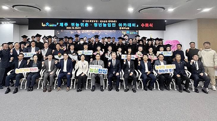 농협중앙회 제주본부(본부장 고우일)는 지난 29일 농협 제주본부 대회의실에서 귀농귀촌·청년농업인 아카데미 교육생 및 농협관계자 100여 명이 참석한 가운데 '2025년 제주 귀농귀촌·청년농업인 아카데미 수료식'을 개최했다.