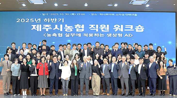 제주시농협(조합장 고봉주)은 지난달 30일 제주시농협 하나로마트 오라점 컨벤션홀에서 임직원 70여 명을 대상으로 '2025년 하반기 직원 워크숍'을 실시했다.
