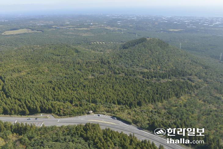 시오름, 분화구 형태가 분명하지 않은 원추형 오름이다. 하논에서 촬영. 사진 김찬수