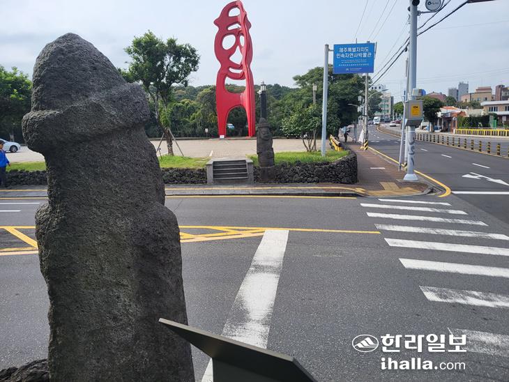 제주도민속자연사박물관 돌하르방. 제주도 민속문화유산으로 지정된 박물관 입구 2기의 돌하르방 너머로 한명섭 작가의 대형 돌하르방 조형물이 서 있다. 진선희기자
