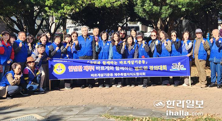바르게살기운동제주도협의회(회장 좌중언)는 지난 3일 제주종합경기장 바르게 표지석 공원 일대에서 임원 50여 명이 참여한 가운데 '안전한 제주! 바르게와 함께하는 범도민 결의대회'를 개최했다.