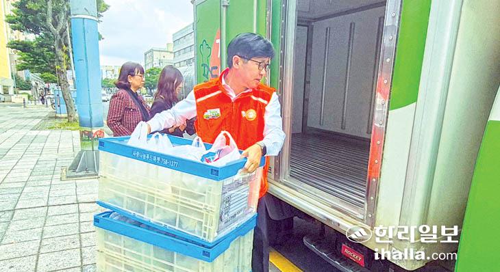 [한라일보] 현원돈 제주시 부시장은 4일 일도2동 소재 사랑나눔푸드마켓·뱅크에서 위촉장을 받은 후 실무자들을 격려하기 위해 1일 명예점장으로 활동했다.
