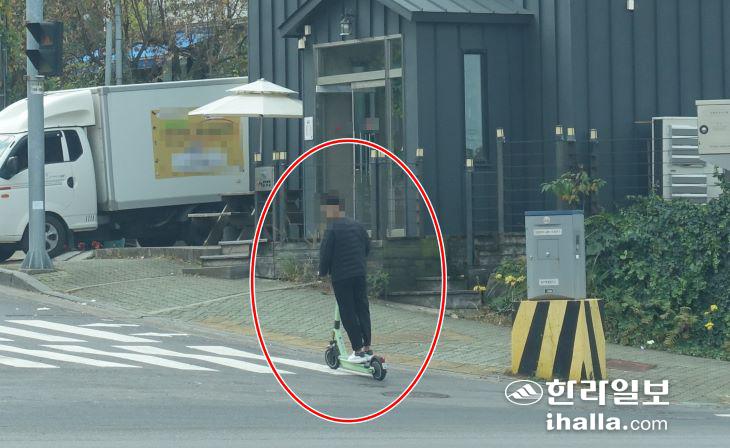 안전모를 쓰지 않고 주행하는 PM 이용자의 모습. 한라일보DB