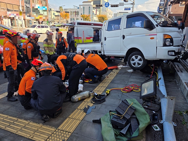 5일 오전 서귀포시 서귀동의 한 도로에서 1t 트럭과 오토바이가 부딪혀 인도를 덮치는 사고가 발생했다. 제주소방안전본부 제공