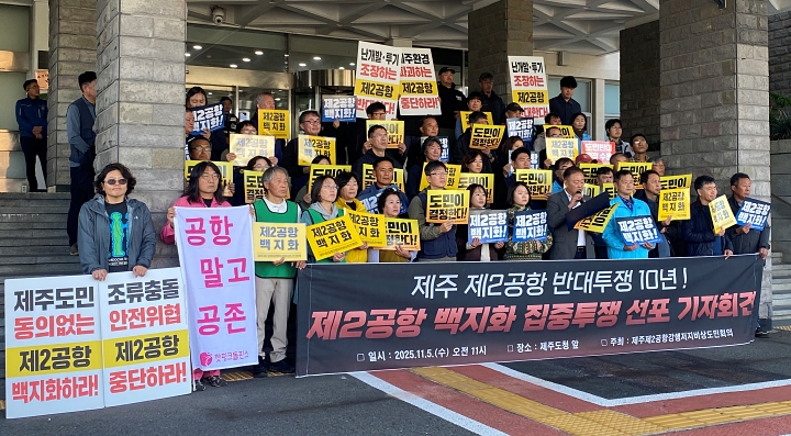 제주제2공항강행저지비상도민회의는 5일 오전 제주도청 앞에서 ‘제주제2공항 반대투쟁 10년, 제2공항 백지화를 위한 집중투쟁 선포’ 기자회견을 열었다.