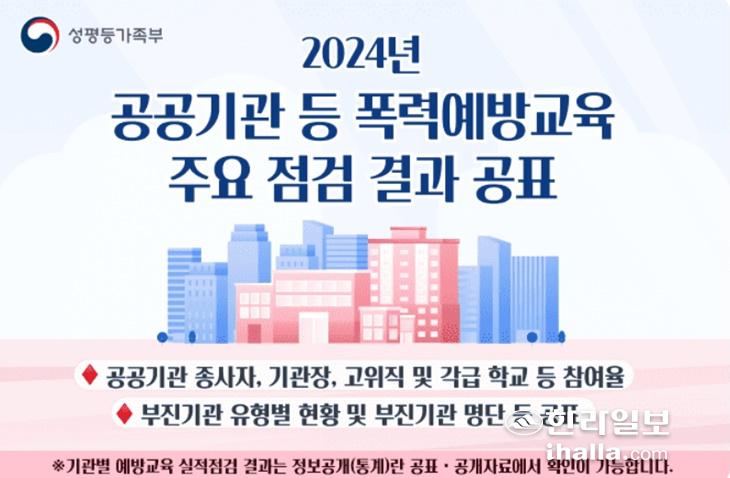 폭력예방교육 부진 기관은 전체의 1.1%(195개)로 2023년과 비슷한 수준을 유지했다. 부진 기관을 유형별로 보면 각급 학교 67개(대학 51, 초·중·고 16), 지방자치단체 59개, 공직유관단체 55개, 국가기관 14개 순이었다. 제주에서는 제주도의회(지방자치단체)와 제주대학교(각급 학교)가 부진 기관 명단에 이름을 올렸다.